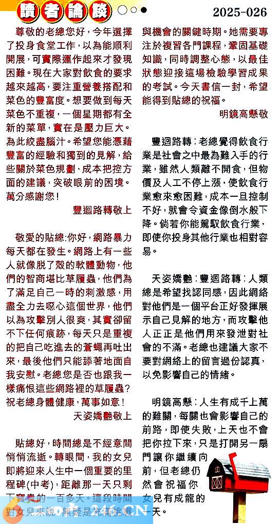 3.貼總好,時間總是不經意間悄悄流逝。轉眼間,我的女兒即將迎來人生中一個重要的里程碑(中考),距離那一天只剩下寶貴的一百多天。這段時間對女兒來說,無疑是充滿挑戰與機會的關鍵時期。她需要專注於複習各門課程,鞏固基礎知識,同時調整心態,以最佳狀態迎接這場檢驗學習成果的考試。今天書信一封,希望能得到貼總的祝福。明鏡高懸敬