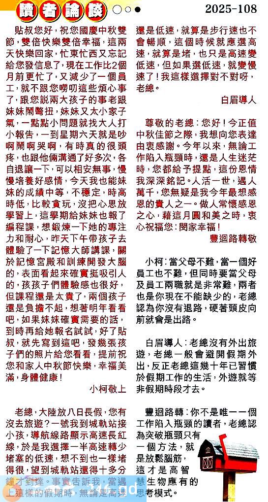 第一零八期讀者論談 1.貼叔您好,祝您國慶中秋雙節,雙倍快樂雙倍幸福,這兩天快樂回家,忙東忙西又忘記給您發信息了,現在工作比2個月前更忙了,又减少了一個員工,就不跟您唠叨這些煩心事了,跟您說兩大孩子的事老跟妹妹鬧警扭,妹妹又太小家子氣,一點點小問題就找大人打小報告,一到星期六天就是吵啊鬧啊哭啊,有時真的很頭疼,也跟他倆溝通了好多次,各自退讓下,可以相安無事,慢慢培養好感情,今天我也能妹妹的成績中等,不穩定,時高時低,比較貪玩,沒把心思放學習上,這學期給妹妹也報了編程課,想鍛煉一下她的專注力和耐心,昨天下午帶孩子去體驗了一下記憶大師講課,關於記憶宮殿和訓練開發大腦的,表面看起來確實挺吸引人的,孩孩子們體驗感也很好,但課程還是太貴了,兩個孩子還是負擔不起,想著明年看看吧,如果妹妹確實需要的話。到時再給她報名試試好了貼叔,就先寫到這吧,發幾張孩子們的照片給您看看,提前祝您和家人中秋節快樂,幸福美滿,身體健康!小柯敬上 〖小柯〗:當父母不難,當一個好員工也不難,但同時要當父母及員工兩職就是非常難,兩者也是你現在不能缺少的,老總認為你沒有退路,硬著頭皮向前就會是出路。 2.老總,大陸放八日長假,您有沒去旅遊?一號我到城軌站接小孩,導航線路顯示高速長紅線,於是我選擇一半高速轉少堵塞的低速,想不到也樣堵得很,望到城軌站還得十多分鐘才到達。事實告訴我,當遇上這樣的假期時,無論是高速還是低速,就算是步行速也不會暢順,這個時候就應選高速,就算是堵,也只是高速變低速,但如果選低速,就變慢速了!我這樣選擇對不對呀老總。白眉導人 〖白眉導人〗:老總沒有外出旅遊,老總一般會避開假期外出,反正老總這幾十年已習慣於假期工作的生活,外遊就等非假期時段才去。 3.尊敬的老總:您好!今正值中秋佳節之際,我想向您表達由衷感謝。今年以來,無論工作陷入瓶頸時,還是人生迷茫時,您都給予提點,這份恩情我深深銘記。人活一世,遇人萬千,您無疑是我今年最想感恩的貴人之一。做人常懷感恩之心,藉這月圓和美之時,衷心祝福您:閔家幸福!豐迴路轉敬 〖豐迴路轉〗:你不是唯一個工作陷入瓶頸的讀者,老總認為突破瓶頸只有一個方法,就是放鬆腦筋,這才是高智慧生物應有的思考模式。