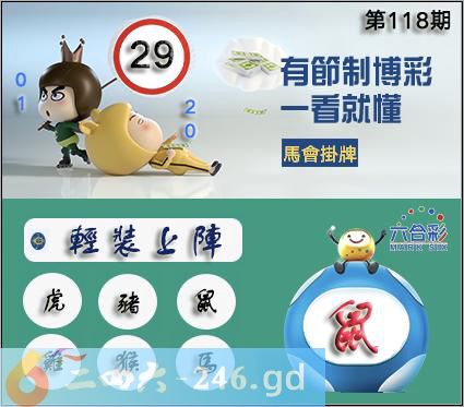 118期正版彩图挂:29 爆:鼠 挂牌成语:轻装上阵 挂牌出肖:虎猪鼠鸡猴马