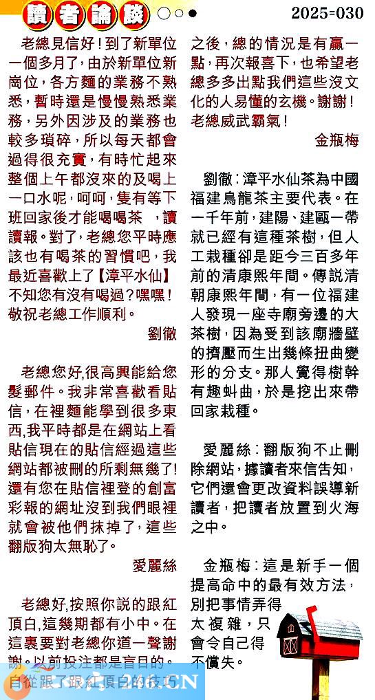 第零三零期讀者論談 1.老總見信好!到了新單位一個多月了,由於新單位新崗位,各方题的業務不熟悉,暫時還是慢慢熟悉業務,另外因涉及的業務也較多瑣碎,所以每天都會過得很充實,有時忙起來整個上午都沒來的及喝上一口水呢,呵呵,隻有等下班回家後才能喝喝茶讀讀報。對了,老總您平時應該也有喝茶的習慣吧,我最近喜歡上了【漳平水仙】不知您有沒有喝過?嘿嘿!敬祝老總工作順利。劉徹 〖劉徹〗:漳平水仙茶為中國福建烏龍茶主要代表。在一千年前,建陽、建甌一帶就已經有這種茶樹,但人工栽種卻是距今三百多年前的清康熙年間。傳說清朝康熙年間,有一位福建人發現一座寺廟旁邊的大茶樹,因為受到該廟牆壁的擠壓而生出幾條扭曲變形的分支。那人覺得樹幹有趣虯曲,於是挖出來帶回家栽種。 2.老總您好,很高興能給您髪郵件。我非常喜歡看貼信,在裡魎能學到很多東西,我平時都是在網站上看貼信現在的貼信經過這些網站都被刪的所剩無幾了!還有您在貼信裡登的創富彩報的網址沒到我們眼裡就會被他們抹掉了,這些翻版狗太無恥了。愛麗絲 〖愛麗絲〗:翻版狗不止刪除網站,據讀者來信告知,它們還會更改資料誤導新讀者,把讀者放置到火海之中。 3.老總好,按照你說的跟紅頂白,這幾期都有小中。在這裏要對老總你道一聲謝謝。以前投注都是盲目的。自從跟了跟紅頂白的技巧之後,總的情況是有贏一點,再次報喜下,也希望老總多多出點我們這些沒文化的人易懂的玄機。謝謝!老總威武霸氣!金瓶梅 〖金瓶梅〗:這是新手一個提高命中的最有效方法,别把事情弄得太複雜,只會令自己得不償失。