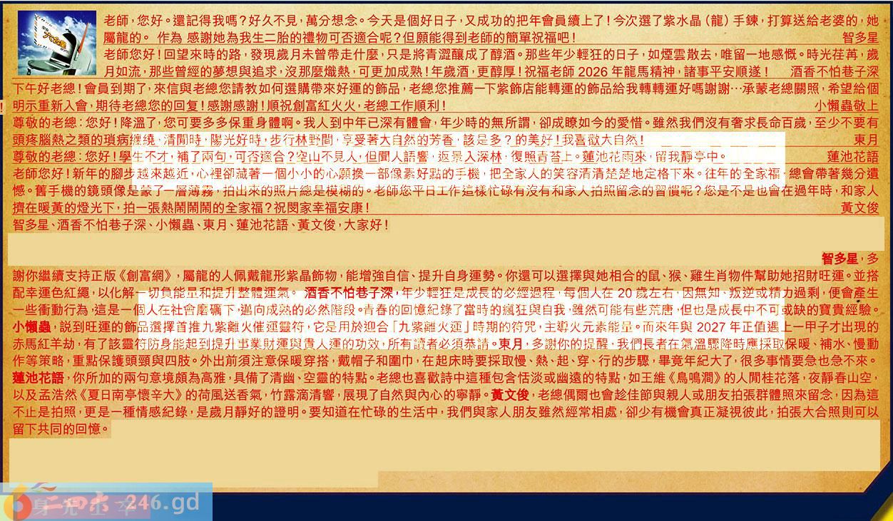 第016期《六合皇信箱文字版》10000%正確!!!正版二四六論壇*精心製作!!! 智多星、酒香不怕巷子深、小懶蟲、東月、蓮池花語、黃文俊,大家好! 【1】.老師,您好。還記得我嗎?好久不見,萬分想念。今天是個好日子,又成功的把年會員續上了!今次選了紫水晶(龍)手錬,打算送給老婆的,她屬龍的。作為感謝谢她為我生二胎的禮物可否適合呢?但願能得到老師的簡單祝福吧!智多星 〖智多星〗:多謝珎繼續支持正版《創富網》,屬龍的人佩戴龍形紫晶飾物,能增強自信、提升自身運勢。你還可以選擇與她相合的鼠、猴、雞生肖物件幫助她招財旺運。並搭配幸運色紅繩,以化解一切負能量和提升整體運氣。 【2】.老師您好!回望來時的路,發現歲月未曾帶走什麼,只是將青涩釀成了醇酒。那些年少輕狂的日子,如煙雲散去,唯留一地感慨。時光荏苒,歲月如流,那些曾經的夢想與追求,沒那麼熾熱,可更加成熟!年歲酒,更醇厚!祝福老師2026年龍馬精神,諸事平安順遂!酒香不怕巷子深 〖酒香不怕巷子深〗:年少輕狂是成長的必經過程,每個人在20歲左右,因無知、叛逆或精力過剩,便會產生一些衝動行為,這是一個人在社會磨礪下邁向成熟的必然階段。情春的回憶紀錄了當時的瘋狂與自我,雖然可能有些荒唐,但也是成長中不可或缺的寶貴經驗。 【3】.下午好老總!會員到期了,來信與老總您請教如何選購帶來好運的飾品,老總您推薦一下紫飾店能轉運的飾品給我轉轉運好嗎謝謝...承蒙老總關照,希望給個明示重新入會,期待老總您的回复!感謝感謝!順祝創富紅火火,老總工作順利!小懒蟲敬上 〖小懶蟲〗:説到旺運的飾品選擇首推九紫離火催運篮符,它是用於迎合「九紫離火運」時期的符咒,主導火元素能量。而來年與2027年正值遇上一甲子才出現的赤馬紅羊劫,有了該靈符防身能起到提升事業財運與貴人運的功效,所有讀者必須恭請。 【4】.尊敬的老總:您好!降溫了,您可要多多保重身體啊。我人到中年已深有體會,年少時的無所謂,卻成瞭如今的愛惜。雖然我們沒有奢求長命百歲,至少不要有頭疼腦熱之類的瑣病纏繞,清閒時,陽光好時,步行林野間,享受著大自然的芳香,該是多?的美好!我喜歡大自然!東月 〖東月〗:多謝你的提醒,我們長者在氣溫驟降時應採取保暖、補水、慢動作等策略,重點保護頭頸與四肢。外出前須注意保暖穿搭,戴帽子和圍巾,在起床時要採取慢、熱、起、穿、行的步驟,畢竟年紀大了,很多事情要急也急不來。 【5】.尊敬的老總:您好!學生不才,補了兩句,可否適合?空山不見人,但聞人語響,返景入深林,復照青苔上。蓮池花雨來,留我静亭中。蓮池花語 〖蓮池花語〗:你所加的兩句意境頗為高雅,具備了清幽、空靈的特點。老總也喜歡詩中這種包含恬淡或幽遠的特點,如王維《鳥鳴澗》的人間桂花落,夜靜春山空,以及孟浩然《夏日南亭懷辛大》的荷風送香氣,竹露滴清響,展現了自然與內心的寧靜。 【6】.老師您好!新年的腳步越來越近,心裡卻藏著一個小小的心願換一部像素好點的手機,把全家人的笑容清清楚楚地定格下來。往年的全家福,總會帶著幾分遺憾。舊手機的鏡頭像是蒙了一層薄霧,拍出來的照片總是模糊的。老師您平日工作這樣忙碌有沒有和家人拍照留念的習慣呢?您是不是也會在過年時,和家人擠在暖黄的燈光下,拍一張熱鬧鬧鬧的全家福?祝閔家幸福安康!黃文俊 〖黃文俊〗:老總偶爾也會趁佳節與親人或朋友拍張群體照來留念,因為這不止是拍照,更是一種情感紀錄,是歲月靜好的證明。要知道在忙碌的生活中,我們與家人朋友雖然經常相處,卻少有機會真正凝視彼此,拍張大合照則可以留下共同的回憶。 紅字:身先士卒 暗码:24314249 [释义]作战时将领亲自带头,冲在士兵前面。现在也用来比喻领导带头,走在群众前面。 [出处]《史记·淮南衡山列传》:“当敌勇敢,常为士卒先。”《资治通鉴·隋纪炀帝大业九年》:“玄感每战,身先士卒,所向摧陷。”