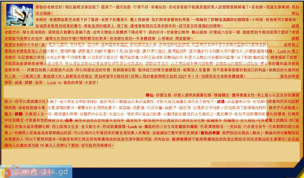 第018期《六合皇信箱文字版》10000%正確!!!正版二四六論壇*精心製作!!! 柳仙、威遠、諦聽、劦哥、、紫色的希望,大家好! 【1】.尊敬的老總您好!現在廠裡沒事放假了,提前了一個月放假,行情不好,有毒似的,回老家看能不能遇見個好男人談個戀愛解解毒了。祝老總一馬當先事業順,馬到成功福繞!柳仙 〖柳仙〗:你要注意,好男人通常具備責任感、情绪穏定,懂得尊重女性、有上進心以及良好的溝通能力。你可以透過擴大社交圈子,在日常生活中展現自信,並運用漏斗篩選法去多認識異性,才能有效提高遇見真命天子的機率。 【2】.老總好,家裡開始要把老房子拆了重建。老房子拆遷那天,麈土飛揚裡,我扒開堆著舊物的角落,一眼嗆到了那輛落滿鋪跡的腳踏車。小時候,爸爸總用它載著我從城西老巷晃到城東的集市,車後座焊的鐵架上,除了我,還堆著剧買的瓜果和新布料。這可是兒時滿滿的回憶啊!威遠 〖威遠〗:説起童年回憶,老總那時候會和同伴在田野間奔跑,或者爬樹摘水果,享受清甜的果汁。偶爾在地上用樹枝畫畫、抓泥鰍、追野兔、玩捉迷藏、跳房子、爬樹等,就是這些單純的小遊戲填滿了放學後的時間,雖然平凡卻最讓人難忘。 【3】.老總您好,學生是湖南的,湖南這天氣實在是摸不透,從昨天開始天氣驟然下降成零下,真的好冷。世事變幻無常,難以揣測,好像這六合彩一樣,誰能想到今晚到底買什麼呢?希望老總能刊登學生的信件,讓學生在您的字裡行間聆聽您的教育。祝老總在新的一年身體健康,心想事成,閔家歡樂。諦聽 〖諦聽〗:天氣和人生一樣,即使變幻無常,若我們內心安定、充滿信心,依然可以走自己的路,以豁達的態度欣賞人生的風景。面對無常,唯有不斷適應新的變化和環境,在無常中找到穩定,才是最有效的應對方式。 【4】.親愛的老師中午牛好!梁小龍先生屬鼠,卒於馬年,鼠沖馬,我有個朋友屬鼠,對於屬鼠的六友,麻煩老師給些建議,怎麼樣平安過午年?或戴什麼飾品?謝謝老師!劦哥 〖劦哥〗:嚴格來説他去世時還未到馬年,還是蛇年。鼠馬相沖可以透過五行調和法來化解,鼠屬陽水馬屬陽火,水火相剋。可穿戴屬土的飾品,如《紫飾店》的紫水晶來通關化解,因土能洩火生金,金又能生水,形成能量循環。 【5】.敬上尊敬的老總我是别人介紹的新手,想轉轉運,請間我是1987年農暦7月29的老鼠,運甚麼生肖好,我想邏個龍,因為我小時候親眼看見過龍飛天,感覺跟龍有機緣。敬上 〖〗:屬鼠的你三合生肖是屬猴和屬龍,代表溝通融洽、一見如故,六合是生肖牛,代表默默的助力或貴人。你佩带上述紫晶或者翡翠飾品的話,可以在相沖之年裡招來好運並得到贵人的幫助,並能讓自己整年更旺更順遂! 【6】.老總好,忘記第幾次來信。未有上過榜,不過吾緊要,六信又好三信又好,每期必跟進。上期見到老總講無償献血。有您大人物支持我都幾興奮架!曬下我的献血記錄,順便傾訴下經歴,可能因為資源總是被壞人透支使用,所以身邊朋友每次見我绑住邦帶語言總是調刺,話獻血吾頂用,真正用血根本無可能免费,血被血站同醫院高價賣出,應享有的權利基本都是虚假等等、、、其實因為親人經歴過大出血,所以知道血液的珍貴,我都廢事反駁,堅持自己的理念繼續堅持,能幫到人至重要,而不是事事都要計較自己的利益。紫飾店的太歲符終於上架,一口氣請三張,要麻煩工作人員幫我合併發出,更加希望早日能收到!好開心我的會員期限又加到2027年1月。信尾祝各位老總身體健康!紫色的希望 〖紫色的希望〗:我們到血站捐血(獻血),無論如何也會幫助到有需要的人,所以不要想那麼多。而國家有明文規定所有無償捐血的血液均須作臨床用途,所有血站、醫療機構都不能將無償捐血的血液出售給任何血液製品的生產單位。非法組織他人出賣血液可處10萬元人民幣以下罰款,並可追究刑事責任。 紅字:隔靴爬癢 暗码:15263041 [释义]比喻说话作文不中肯,不贴切,没有抓住要点。或做事没有抓住关键。 [出处]清·钱大昭《迩言》卷六:“《朱子语类》云:圣人只是识得性。百家纷纷,只是不识性字。扬子鹘鹘突突,荀子又所谓隔靴爬痒。”