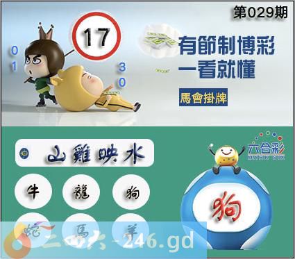 029期正版彩图挂:17 爆:狗 挂牌成语:山鸡映水 挂牌出肖:牛龙狗蛇马羊