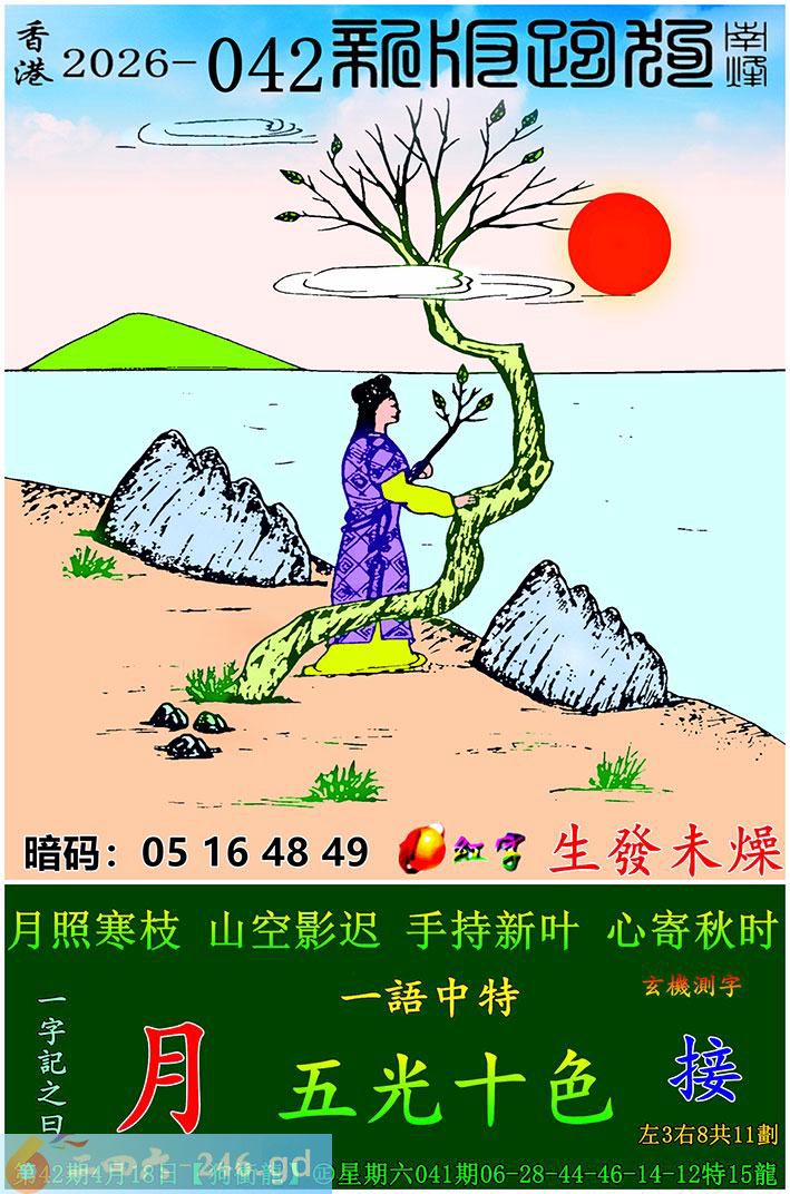 042期跑狗一字記之曰:【月】 月照寒枝,山空影遲。 手持新葉,心寄秋時。 玄機測字:《接》 一語中特:五光十色